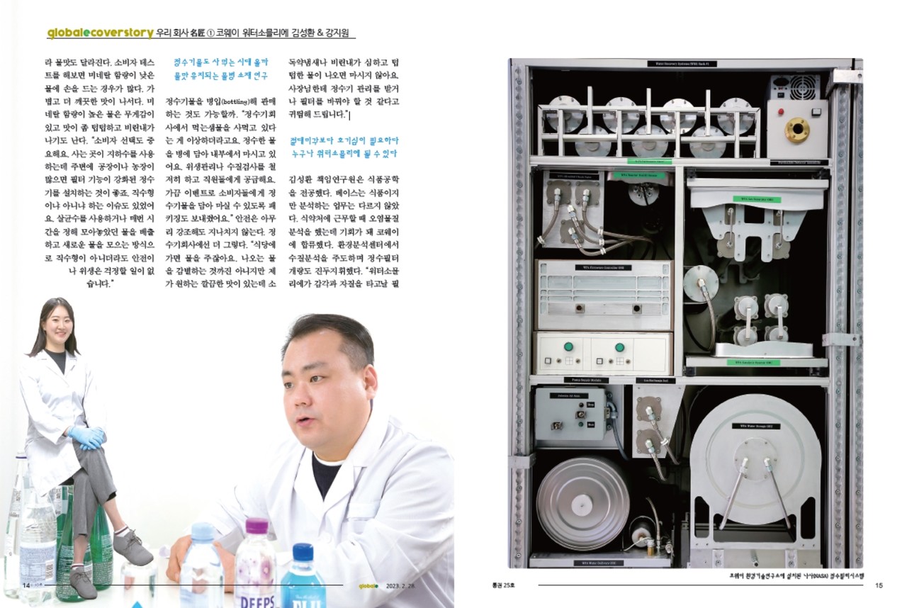 "정수기회사에서 먹는샘물을 사먹고 있다는 게 이상하더라고요. 정수한 물을 병에 담아 내부에서 마시고 있어요. 위생관리나 수질검사를 철저히 하고 직원들에게 공급해요. 가끔 이벤트로 소비자들에게 정수기물을 담아 마실 수 있도록 패키징도 보내줬어요."