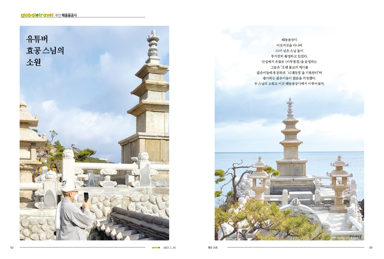 해동용궁사 이곳저곳을 다니며 60이 넘은 스님 둘이 부지런히 촬영하고 있었다. 안성에서 유튜브 〈아무풍경〉을 운영하는 그들은 "오랜 불교의 역사를 젊은이들에게 전하려 'AI대장경'을 기록한다"며 출가하는 젊은이들이 없음을 걱정했다. 두 스님의 소원도 이곳 해동용궁사에서 이루어질까.
