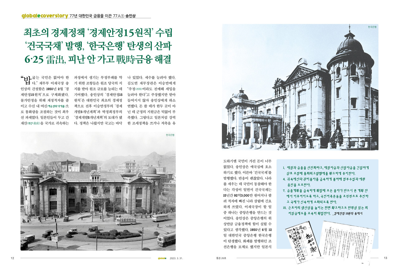 "밥 굶는 국민은 없어야 한다." 재무부 이재국장 송인상의 간절함은 1950년 2월 '경제안정15원칙'으로 구체화됐다. 물가안정을 위해 재정적자를 줄이고 수신 내 여신(예금 범위 내 대출)으로 통화량을 조절하는 것이 최우선 과제였다. 일본인들이 두고 간 재산(적산・敵産)을 국가로 귀속하는 과정에서 생기는 부정부패를 막기 위한 조항들은 원조 당국의 지지를 받아 원조 규모를 늘리는 데 기여했다.