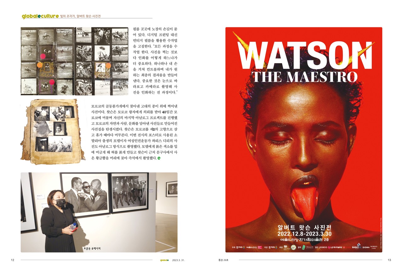 왓슨은 모로코를 제2의 고향으로 삼고 휴가 때마다 머무른다. 이번 전시의 포스터로 사용된 소말리아 출생의 모델이자 여성인권운동가 와리스 디리의 사진도 아날로그 방식으로 촬영했다. 모델에게 붉은 색소를 입에 머금게 해 혀를 붉게 만들고 왓슨이 근처 문구사에서 사온 황금뿔을 머리에 꽂아 즉석에서 촬영했다. 〈끝〉