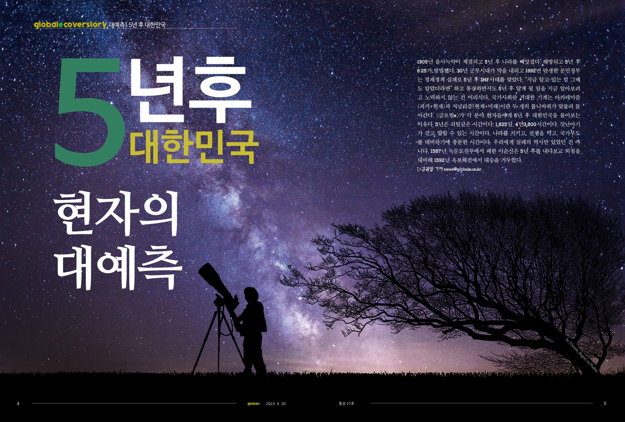 1905년 을사늑약이 체결되고 5년 후 나라를 빼앗겼다. 해방되고 5년 후 6・25가 발발했다. 30년 군부시대가 막을 내리고 1992년 탄생한 문민정부는 경제정책 실패로 5년 후 IMF사태를 맞았다. "지금 알고 있는 걸 그때도 알았더라면" 하고 통감하면서도 5년 후 알게 될 일을 지금 알아보려고 노력하지 않는 건 어리석다. 국가사회란 거대한 기계는 아카데미즘(과거+현재)과 저널리즘(현재+미래)이란 두 개의 톱니바퀴가 맞물려 돌아간다. 〈글로벌e〉가 각 분야 현자들에게 5년 후 대한민국을 물어보는 이유다. 5년은 쇠털같은 시간이다. 1,825일, 4만3,800시간이다. 갓난아기가 걷고 말할 수 있는 시간이다. 나라를 지키고, 전쟁을 막고, 국가부도를 대비하기에 충분한 시간이다. 우리에게 실패의 역사만 있었던 건 아니다. 1587년 녹둔도전투에서 패한 이순신은 5년 후를 내다보고 외침을 대비해 1592년 옥포해전에서 대승을 거두었다.