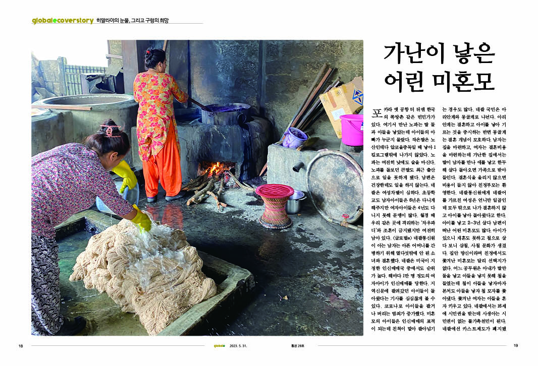 네팔은 여성차별이 심하다. 초등학교도 남자아이들은 6년은 다니게 해주지만 여자아이들은 4년도 다니지 못해 문맹이 많다. 월경 때 우리 같은 곳에 격리하는 '차우파디'와 조혼이 금지됐지만 여전히 남아 있다. 〈글로벌e〉 네팔통신원이 아는 남자는 아픈 어머니를 간병하기 위해 열다섯밖에 안 된 소녀와 결혼했다.