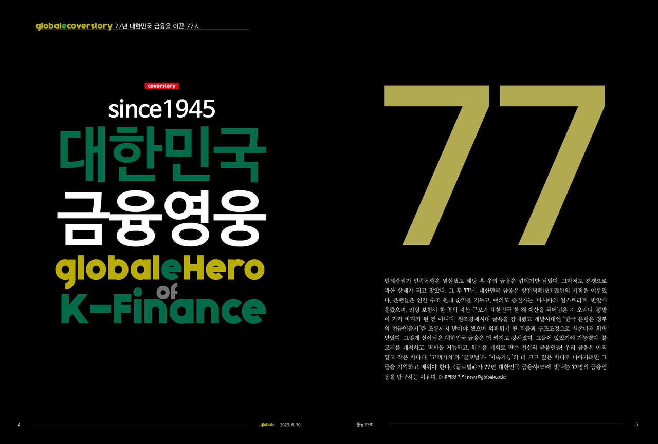 일제강점기 민족은행은 말살됐고 해방 후 우리 금융은 껍데기만 남았다. 그마저도 전쟁으로 파산 상태가 되고 말았다. 그 후 77년. 대한민국 금융은 상전벽해(桑田碧海)의 기적을 이루었다. 은행들은 연간 수조 원대 순익을 거두고, 여의도 증권가는 '아시아의 월스트리트' 반열에 올랐으며, 리딩 보험사 한 곳의 자산 규모가 대한민국 한 해 예산을 뛰어넘은 지 오래다. 뽕밭이 거저 바다가 된 건 아니다. 원조경제시대 굴욕을 감내했고 개발시대엔 "한국 은행은 정부의 현금인출기"란 조롱까지 받아야 했으며 외환위기 땐 퇴출과 구조조정으로 생존마저 위협받았다. 그렇게 살아남은 대한민국 금융은 더 커지고 강해졌다. 그들이 있었기에 가능했다. 불모지를 개척하고, 혁신을 거듭하고, 위기를 기회로 만든 전설의 금융인들! 우리 금융은 아직 얕고 작은 바다다. '고객가치'와 '글로벌'과 '지속가능'의 더 크고 깊은 바다로 나아가려면 그들을 기억하고 배워야 한다. 〈글로벌e〉가 77년 대한민국 금융사(史)에 빛나는 77명의 금융영웅을 탐구하는 이유다.