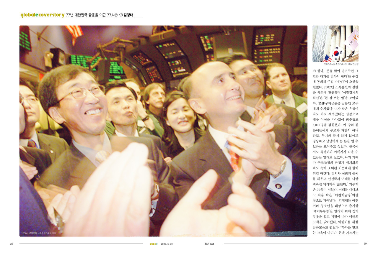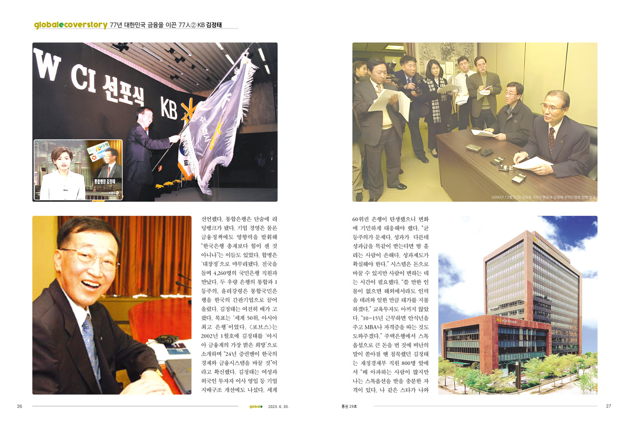 <포브스>는 2002년 1월호에 김정태를 '아시아 금융계의 가장 밝은 희망'으로 소개하며 "24년 증권맨이 한국의 경제와 금융시스템을 바꿀 것"이라고 확신했다. 김정태는 여성과 외국인 투자자 이사 영입 등 기업지배구조 개선에도 나섰다. 세계 60위권 은행이 탄생했으니 변화에 기민하게 대응해야 했다.