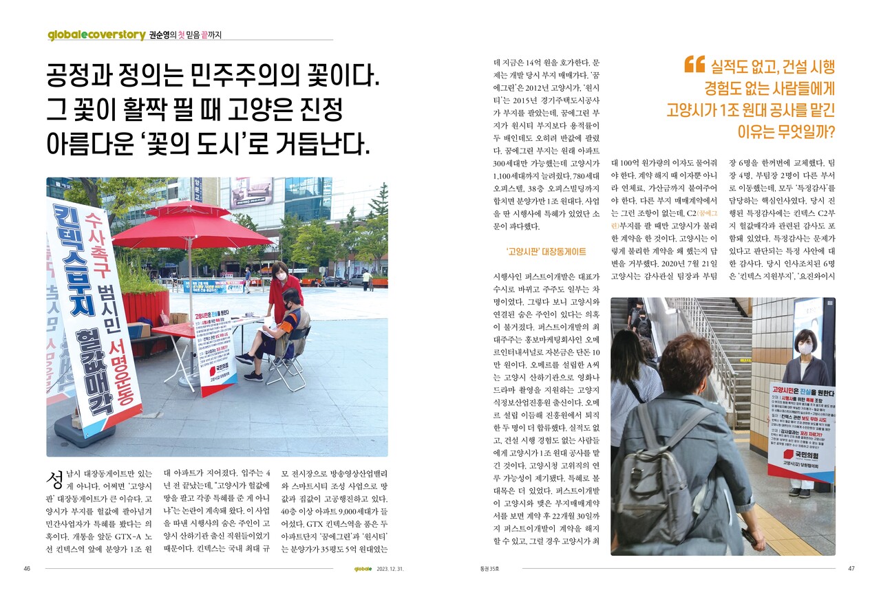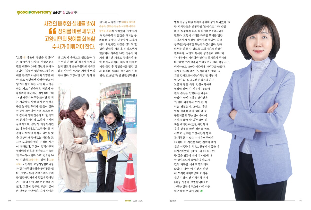 서명운동을 펼칠 때였다. 20대 청년이 찾아와 물었다. "잘못이 있더라도 제가 피해를 본 것도 아닌데 왜 서명을 해야 하죠? 일산에서 발생한 일을 덕양구에 살고 있는 내게 왜 서명을 받는 거죠?" 권순영은 적잖게 당황했지만 차근차근 설명했다. "내가 낸 세금이 허투루 쓰이면 안 되는 거잖아요. 당장 내게 큰 영향을 주진 않지만 우리가 낸 돈이 잘못된 곳에 쓰인다면 우리 스스로 바로 잡아야 하지 않을까요? 한 지역의 문제가 아니라 고양시 전체의 문제라고요. 성남시 대장동사건도 마찬가지예요." 토착비리를 척결하고 2022년 특례시 원년을 맞은 고양시가 부패없는 새로운 도시로 도약해야 한다. 진실의 시간이 다가왔다. 고양시 킨텍스부지 헐값매각 의혹을 철저하고 신속하게 수사해야 한다.