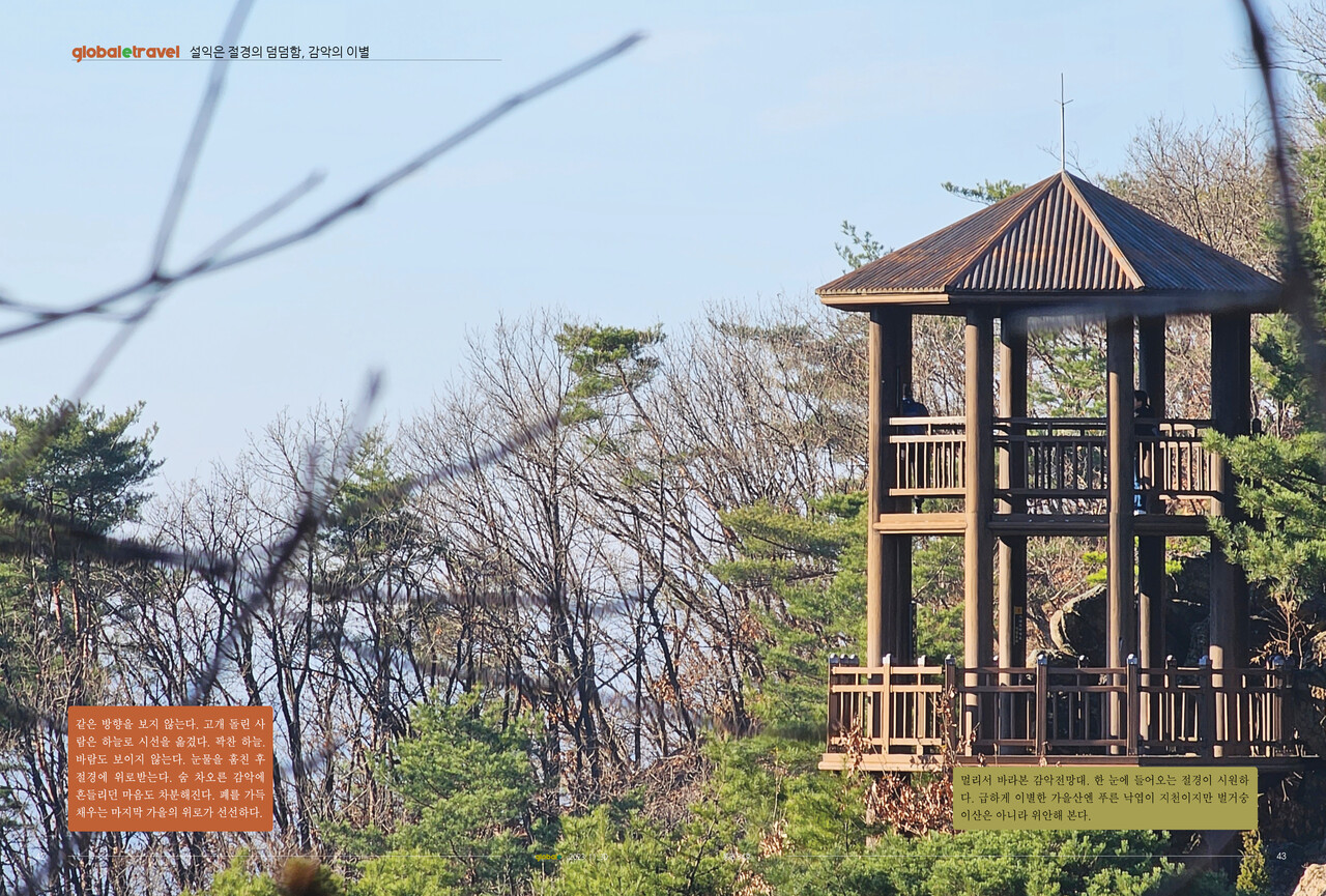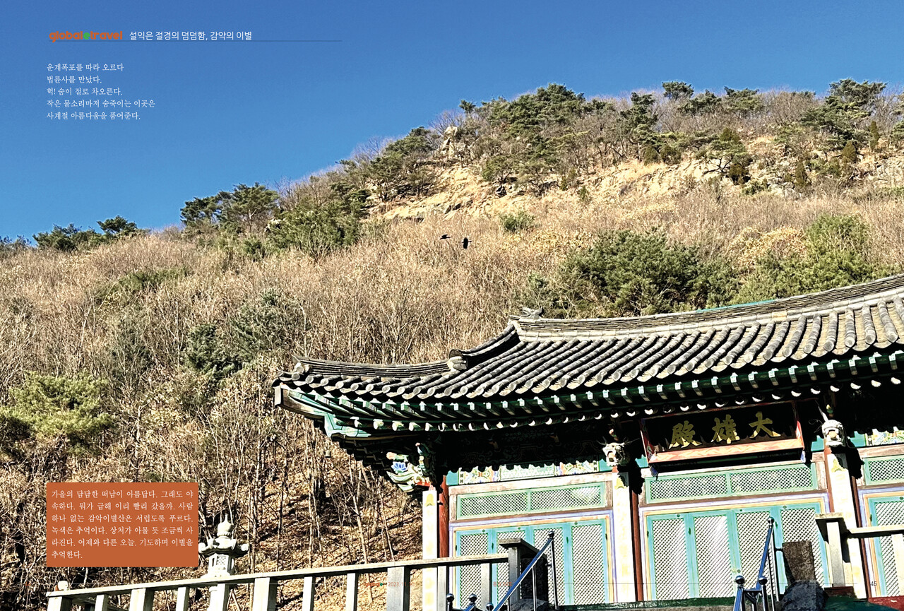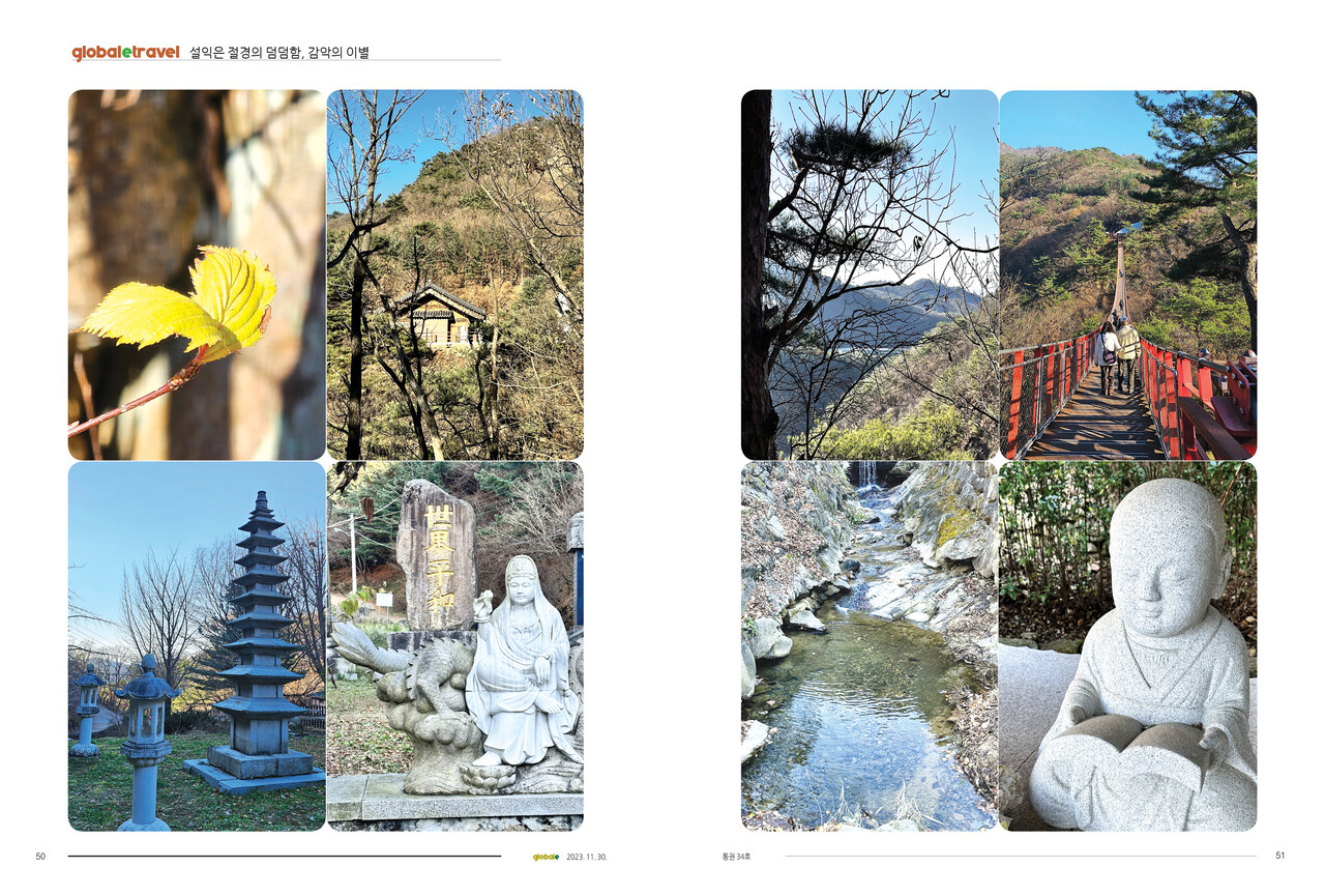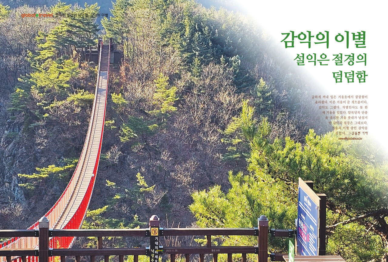 급하게 꺼내 입은 겨울옷에서 쿰쿰함이 올라왔다. 이른 겨울이 준 게으름이다. 감악도 그랬다. 작별인사도 못 한 채 겨울을 입었다. 알록달록 단풍을 대신한 겨울 풋내가 낯설지만 감악의 절경은 그대로다. 가을과 이별 중인 감악을 걸었다.