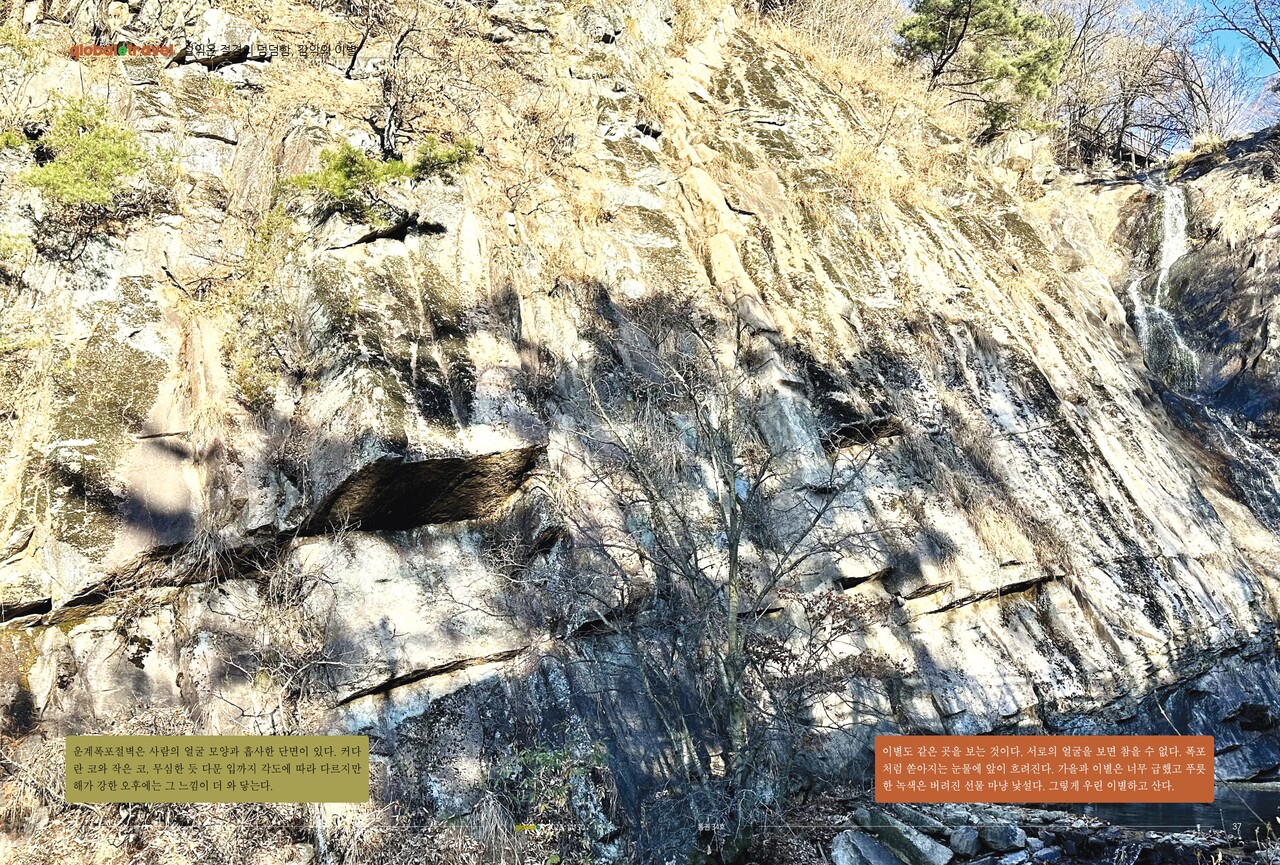 운계폭포절벽은 사람의 얼굴 모양과 흡사한 단면이 있다. 커다란 코와 작은 코, 무심한 듯 다문 입까지 각도에 따라 다르지만 해가 강한 오후에는 그 느낌이 더 와 닿는다.