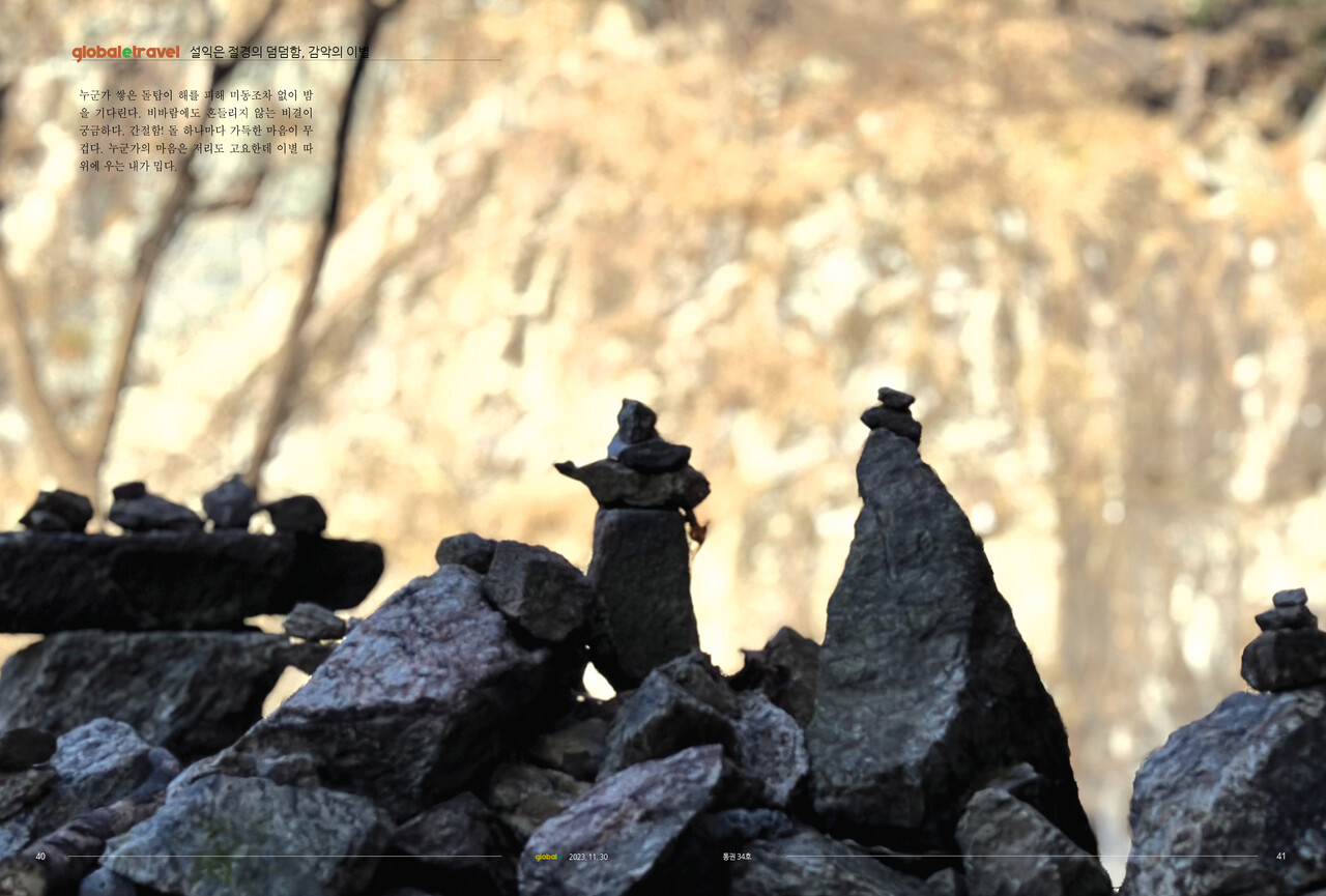 누군가 쌓은 돌탑이 해를 피해 미동조차 없이 밤을 기다린다. 비바람에도 흔들리지 않는 비결이 궁금하다. 간절함! 돌 하나마다 가득한 마음이 무겁다. 누군가의 마음은 저리도 고요한데 이별 따위에 우는 내가 밉다.