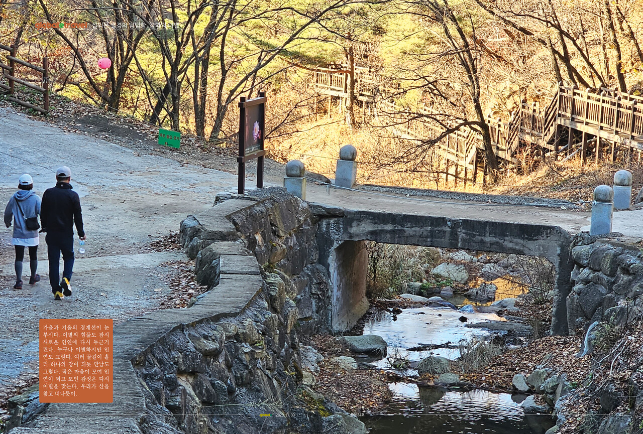 가을과 겨울의 경계선이 눈부시다. 이별의 힘듦도 잠시 새로운 인연에 다시 두근거린다. 누구나 이별하지만 인연도 그렇다. 여러 물길이 흘러 하나의 강이 되듯 만남도 그렇다. 작은 마음이 모여 인연이 되고 모인 감정은 다시 이별을 맞는다. 우리가 산을 찾고 떠나듯이.