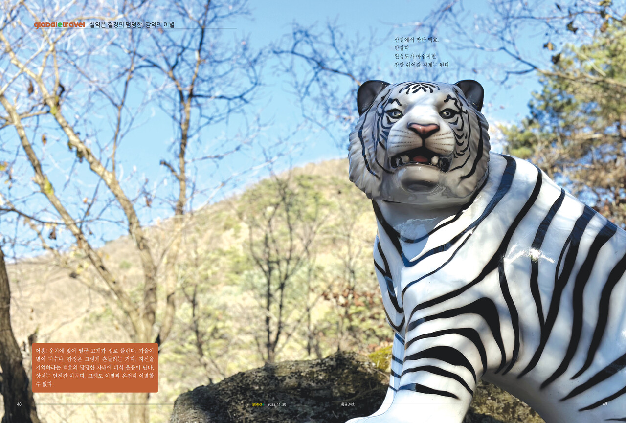 어흥! 운치에 젖어 떨군 고개가 절로 들린다. 가을이별이 대수냐. 감정은 그렇게 흔들리는 거다. 자신을 기억하라는 백호의 당당한 자태에 피식 웃음이 난다. 상처는 언젠간 아문다. 그래도 이별과 온전히 이별할 수 없다.