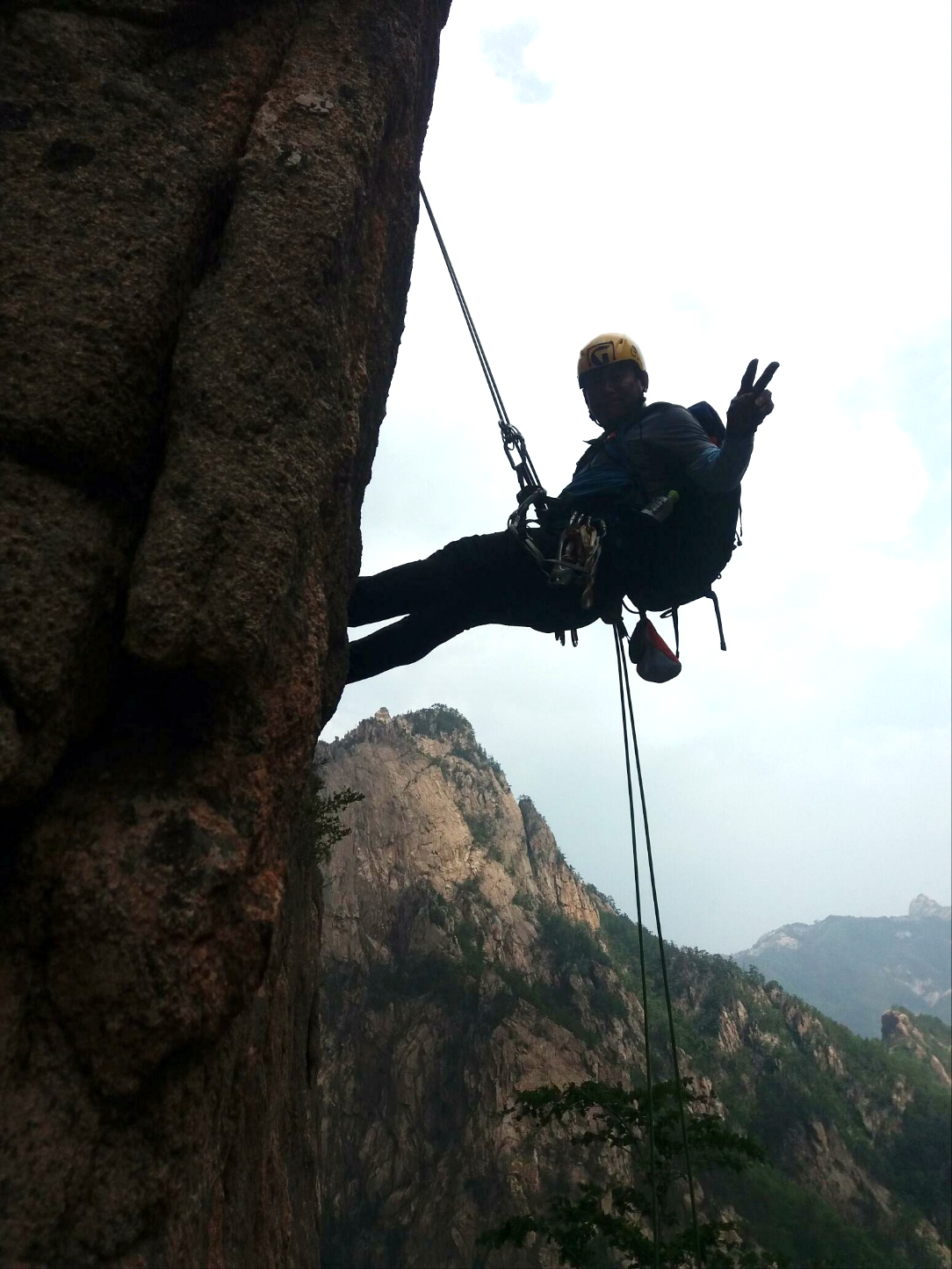 3피치까지는 가뿐했다. 4피치 10미터 지점 볼트에 자일을 걸어 중등, 말등으로 내려줘야 하는데 9미터 지점에서 드르륵---. 거친 화강암인 인수봉 벽과 달리 춘클릿지는 편마암이라 미끄러운데 김 대장이 걸려든 것이다. 선등이 자일을 걸기 전에 미끄러지면 올라간 높이(달고 간 자일 길이)의 두 배만큼 추락하게 된다. 선등 사고가 치명적인 건 그래서다.