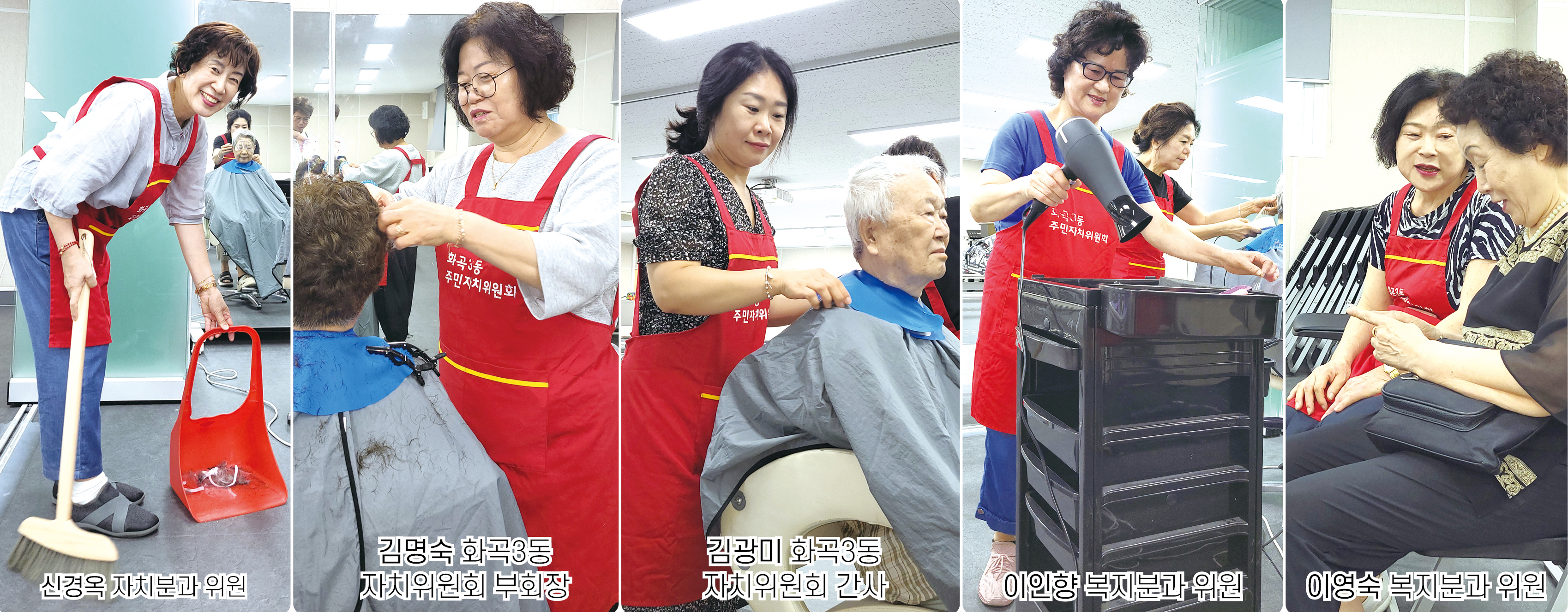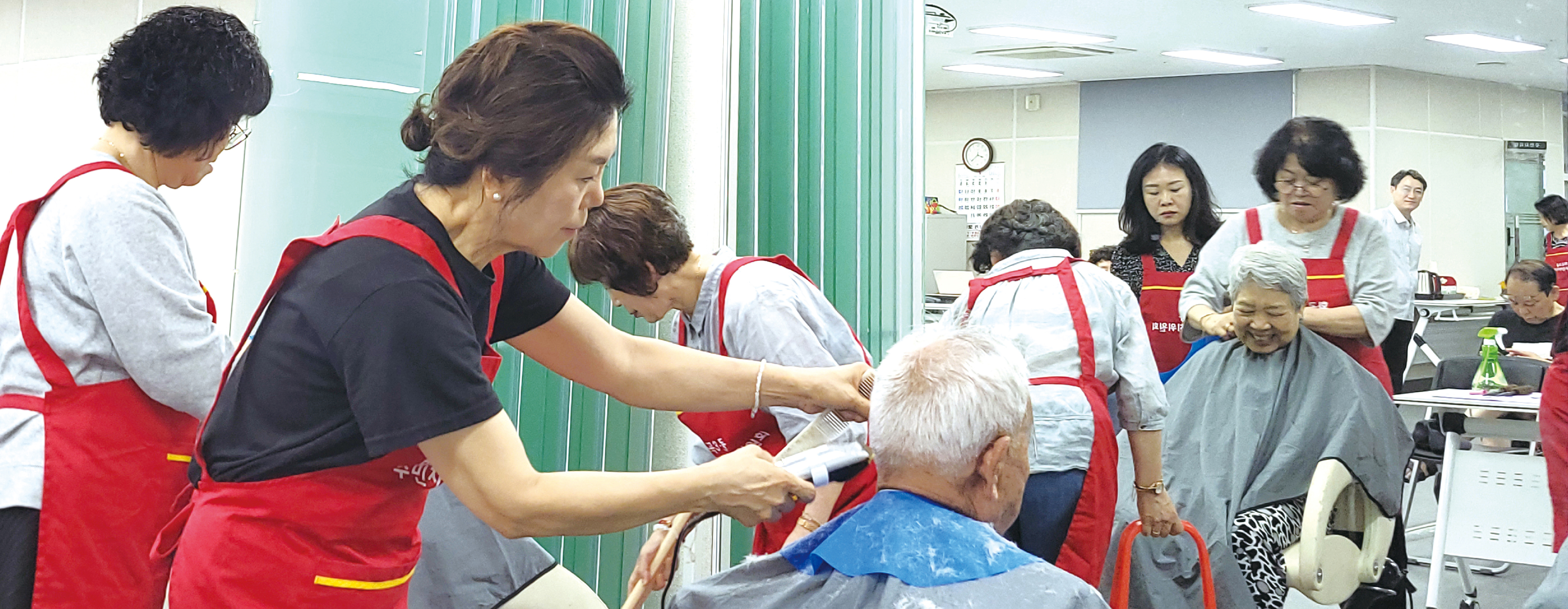 1999년 시작한 '어르신 이·미용' 봉사는 허우인 '에뿌제헤어부띠끄' 원장의 제안으로 주민자치위원회 사업으로 본격화했다. 허 원장과 허선임 디자이너가 가위와 빗을 잡고 주민자치위 위원들과 주민센터 직원들이 보조한다. 어르신들을 반기며 번호표를 나누어주고, 대기석으로 안내하고, 순서대로 미용의자에 앉힌 후 가운을 입혀주고, 손질을 마치면 머리카락을 털어주고, 바닥에 떨어진 머리카락을 쓸어 담고, 대기석에서 어르신 옆에 앉아 안부를 물으며 말벗이 돼 주는 일련의 과정이 일사불란하다.