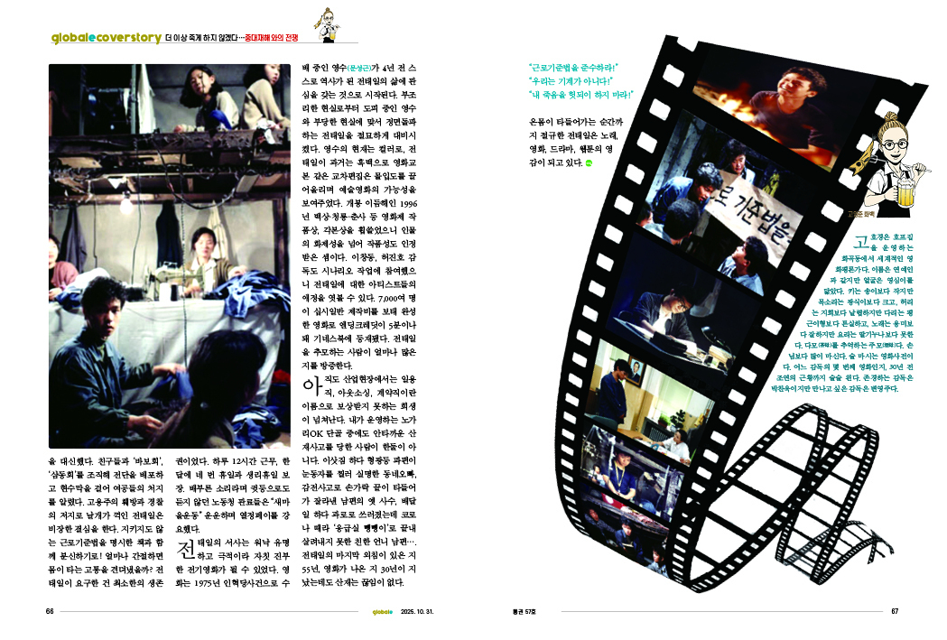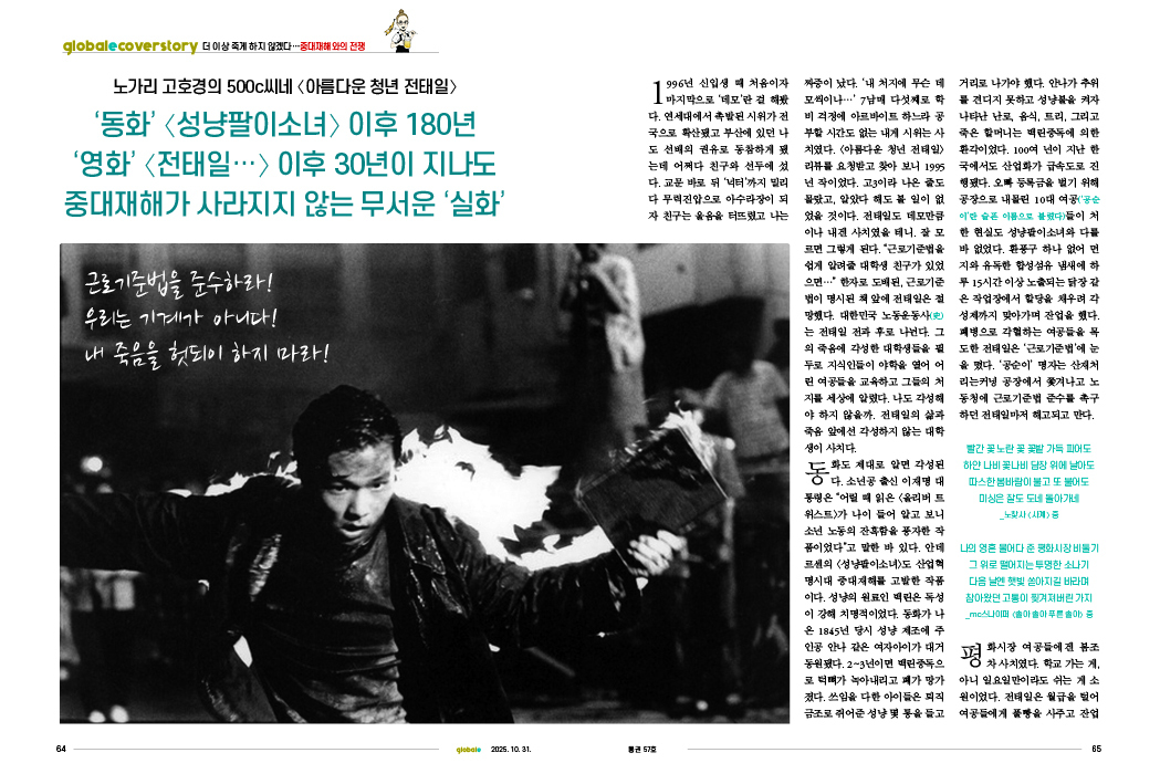 아직도 산업현장에서는 일용직, 아웃소싱, 계약직이란 이름으로 보상받지 못하는 희생이 넘쳐난다. 내가 운영하는 노가리OK 단골 중에도 안타까운 산재사고를 당한 사람이 한둘이 아니다. 이삿짐 하다 형광등 파편이 눈동자를 찔러 실명한 동네오빠, 감전사고로 손가락 끝이 타들어가 잘라낸 남편의 옛 사수, 배달일 하다 과로로 쓰러졌는데 코로나 때라 '응급실 뺑뺑이'로 끝내 살려내지 못한 친한 언니 남편···. 전태일의 마지막 외침이 있은 지 55년, 영화가 나온 지 30년이 지났는데도 산재는 끊임이 없다.