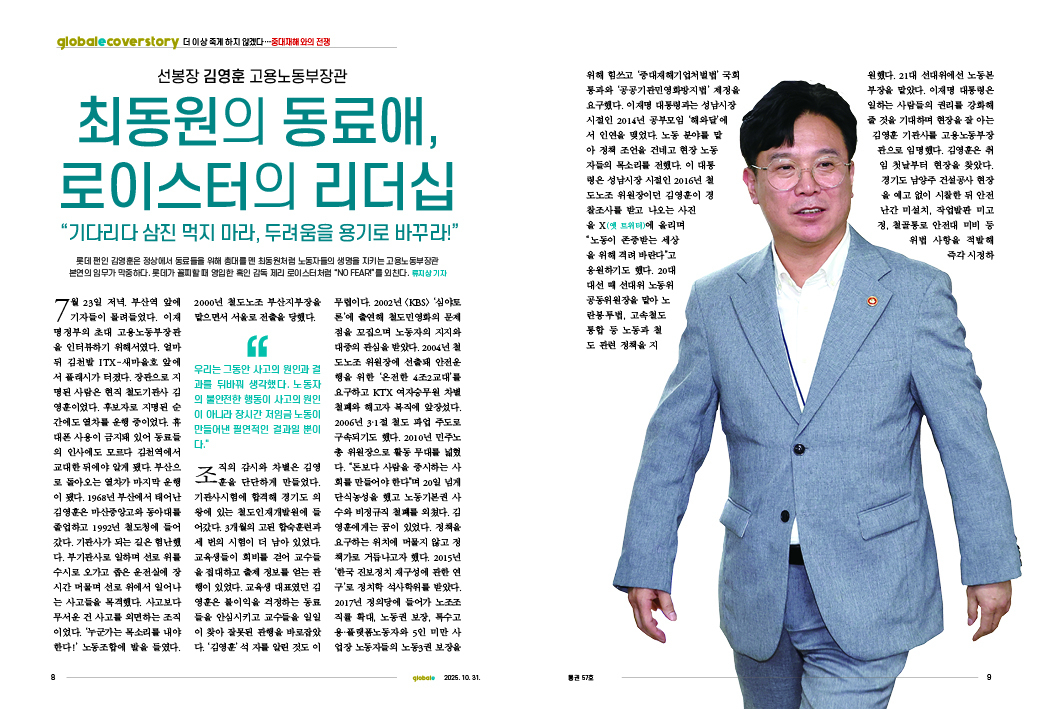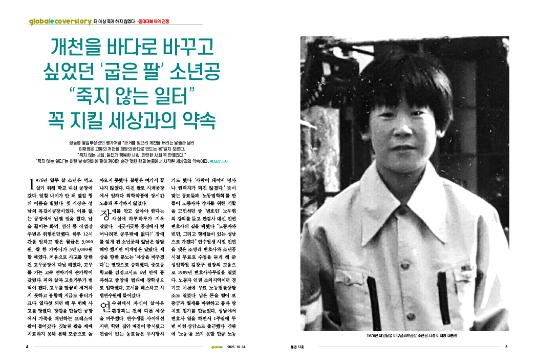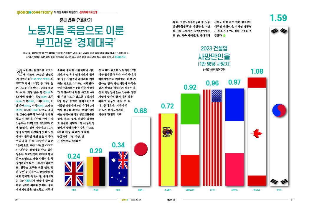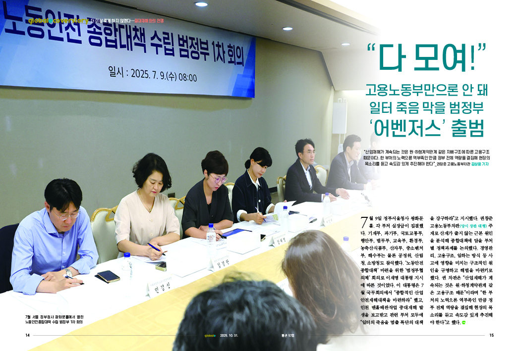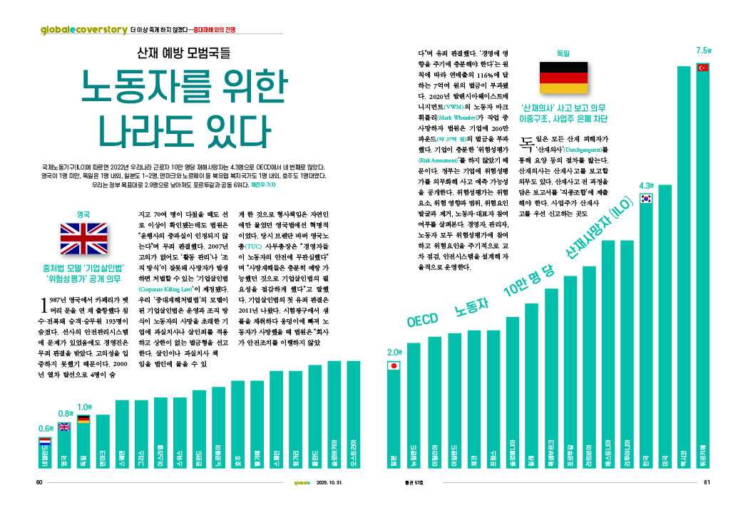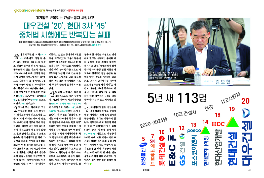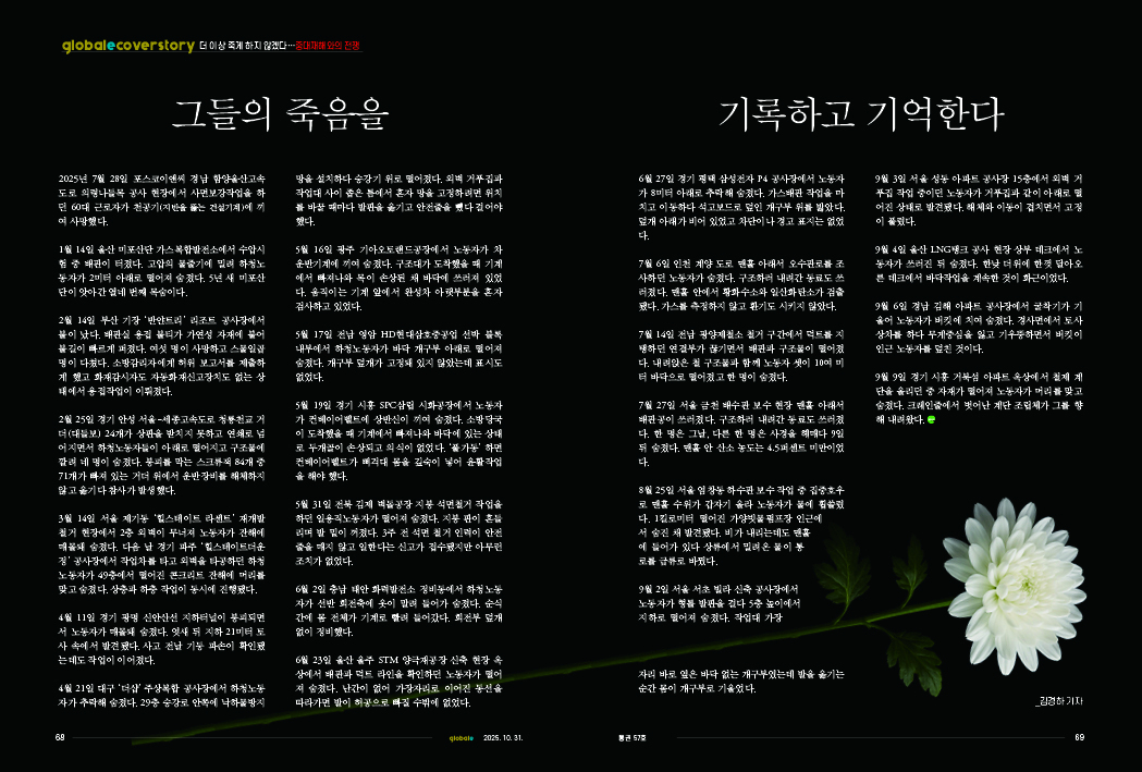 9월 30일 <글로벌e> 10월호가 발간됐다. 이재명정부가 출범 초부터 강력하게 추진하는 '중대재해와의 전쟁'을 탐사한 "더 이상 죽게 하지 않겠다"가 커버스토리다.